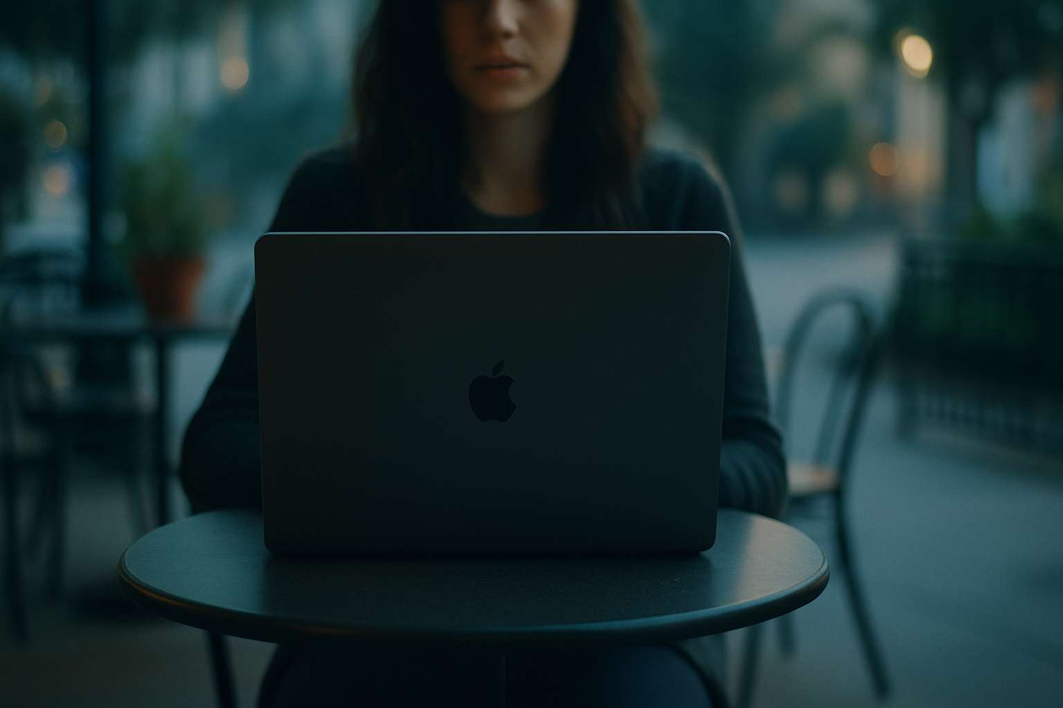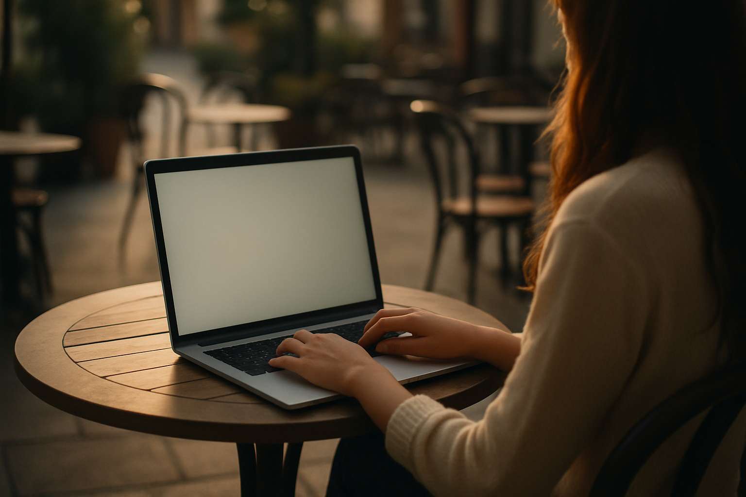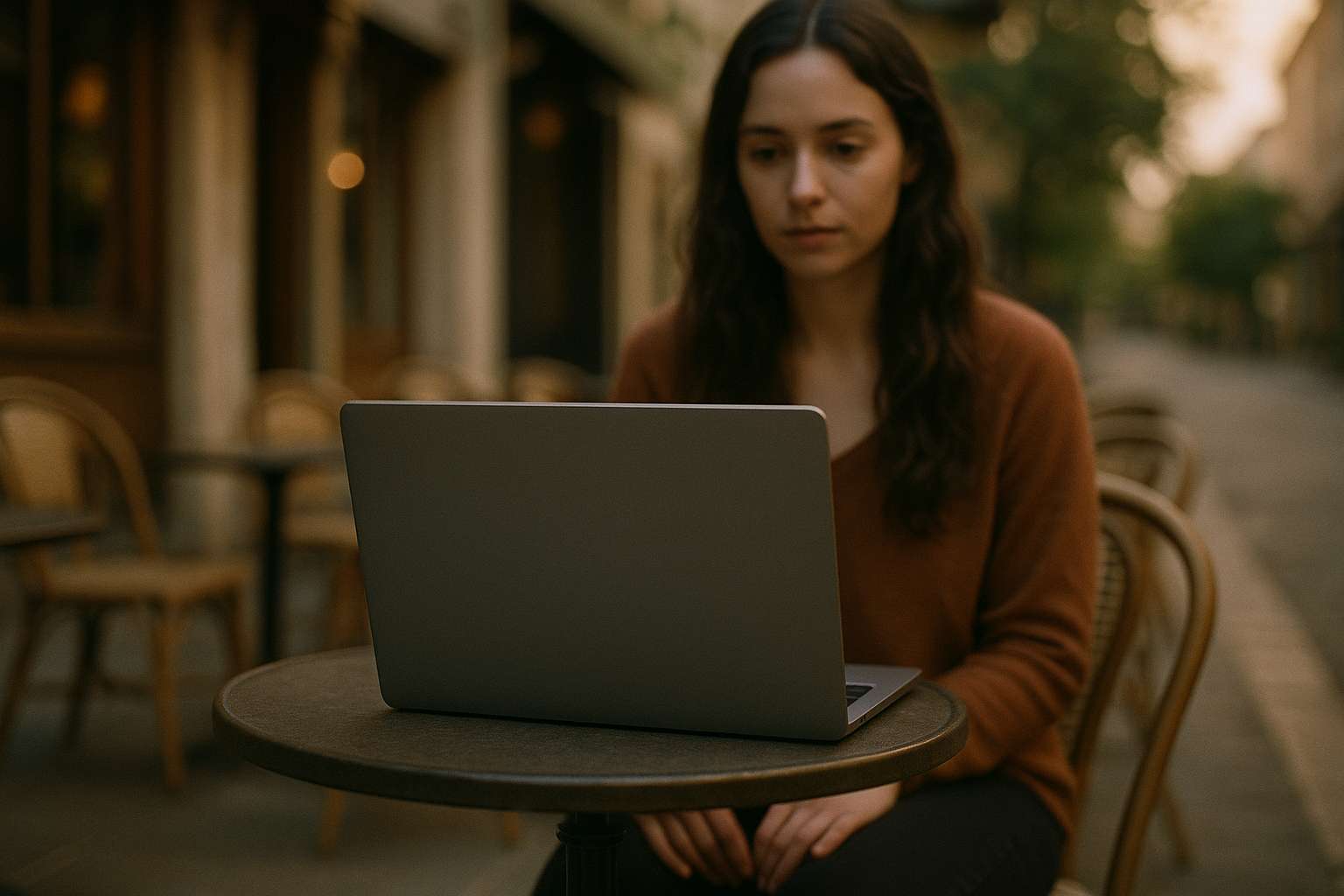 A quiet open-air café. A long-haired woman is sitting at a table with an open laptop. The camera is fixed and tightly framed to fully show the laptop screen, with only her hands and torso partially visible. Soft morning light. Cinematic style, shallow depth of field. -- still image