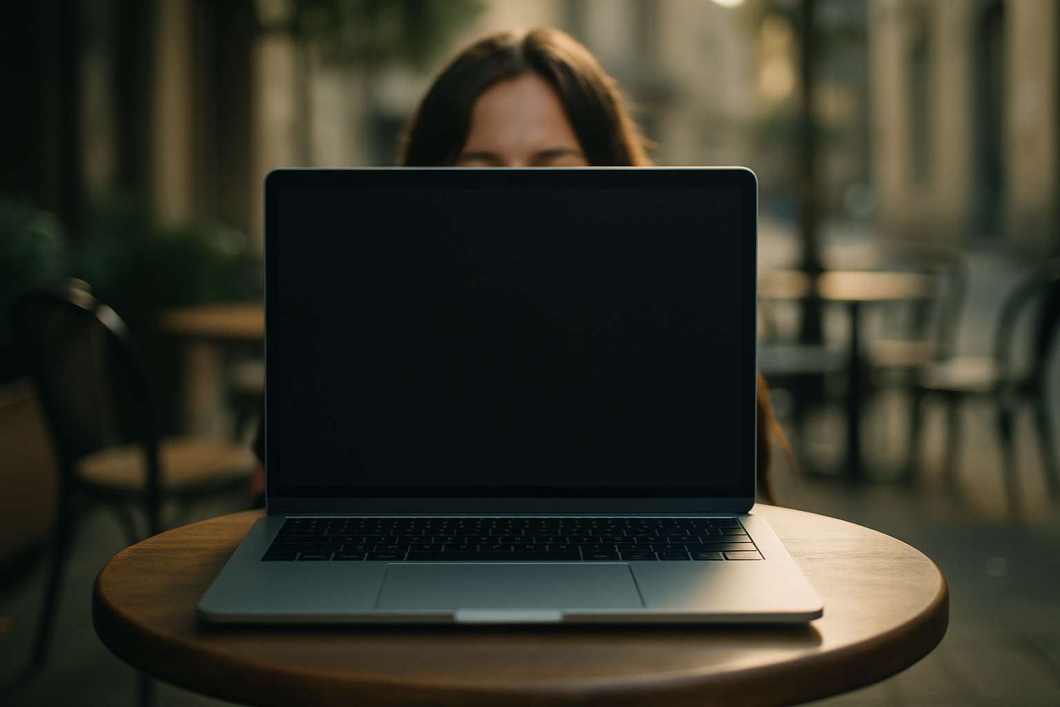 A small round table at an open-air café. A laptop sits on the table, facing the camera. The camera is fixed and closely framed so the laptop screen takes up about 80% of the frame. The screen is blank, softly lit, and clearly visible. A woman sits behind the laptop, but her face is completely hidden by the screen. Only her shoulders or hair might be barely visible behind the laptop. Soft morning lighting, cinematic style with shallow depth of field.