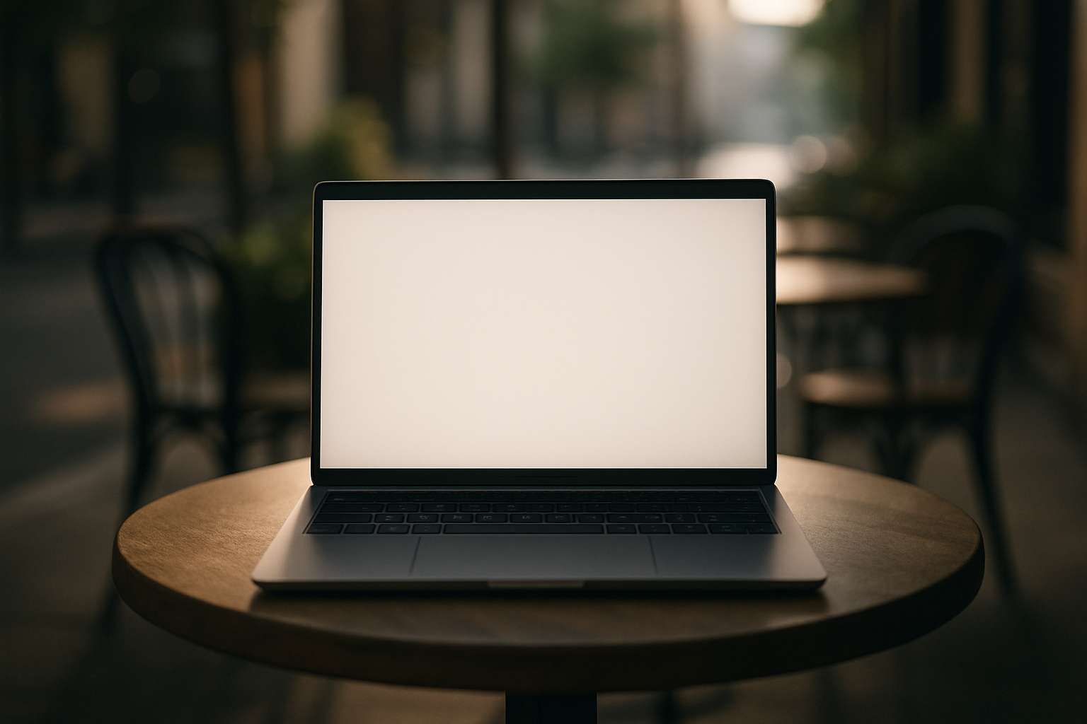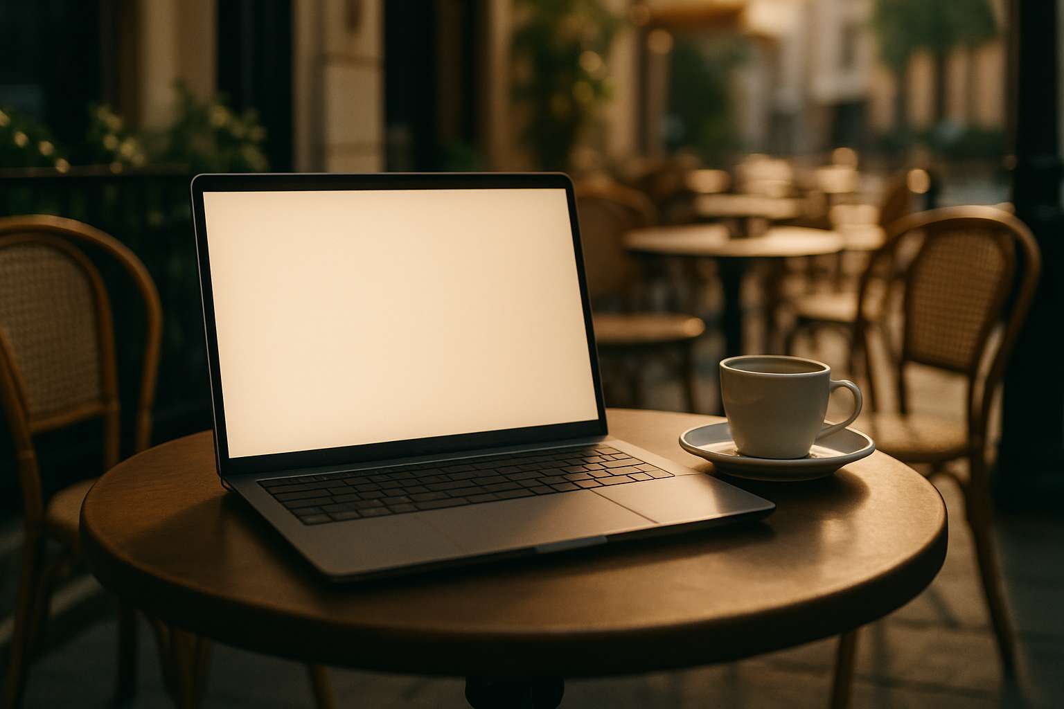 A small round table in an open-air cafe. A laptop is placed on the table, facing the camera. The camera is stationary and close to the frame, so the laptop screen takes up about 80% of the frame. The screen is blank and bathed in soft light, making it clearly visible. The soft morning light and shallow depth of field create a cinematic style.