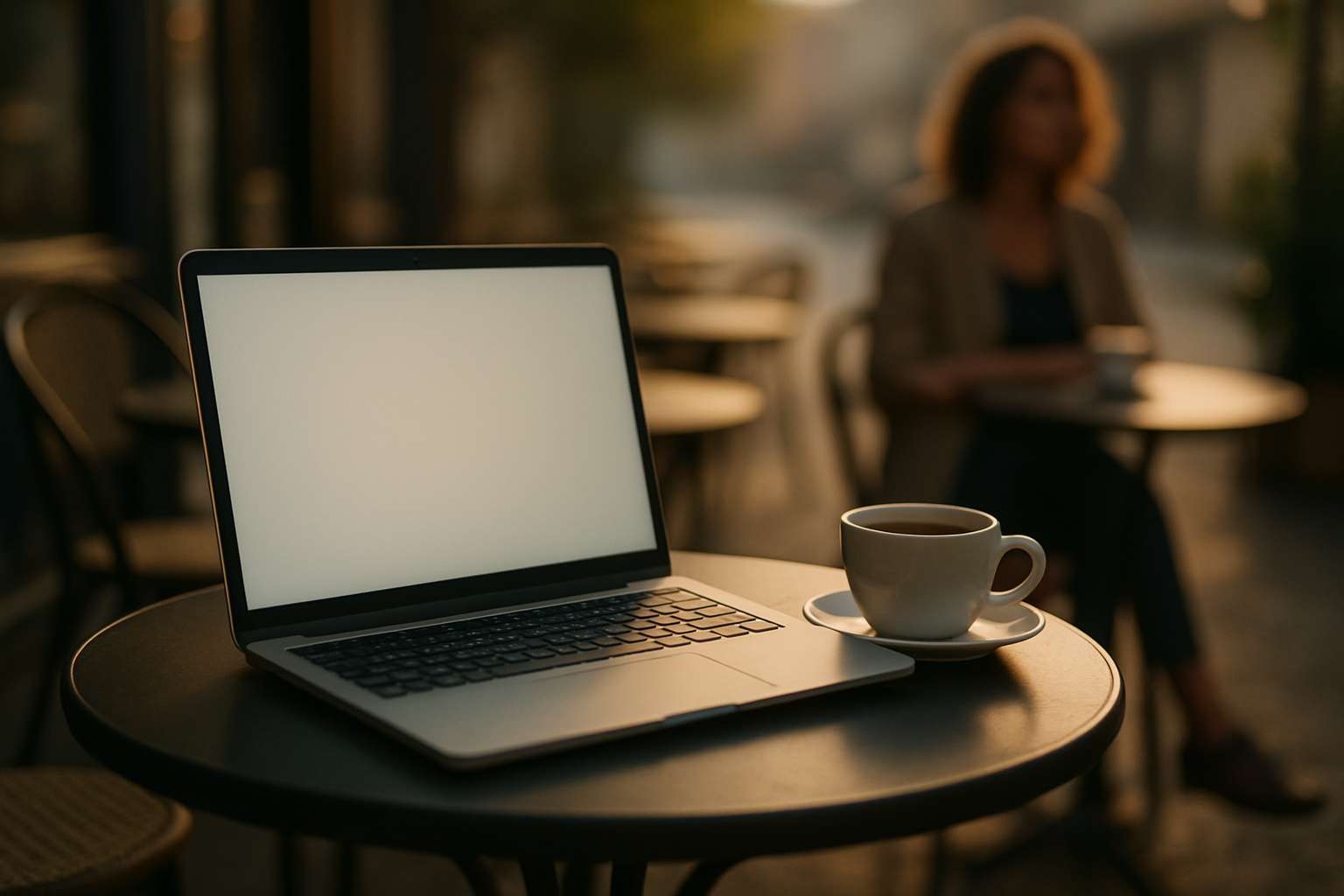 A small round table at an open-air café in the early morning. A laptop is placed on the table, angled slightly to the left but mostly facing the camera. The screen is turned on but blank, taking up a large portion of the frame. A cup of coffee sits beside the laptop. In the background, a woman is sitting casually at another table, softly out of focus. The camera is fixed and slightly zoomed in to emphasize the laptop screen. The scene is lit with soft, warm morning light in a cinematic style with shallow depth of field.