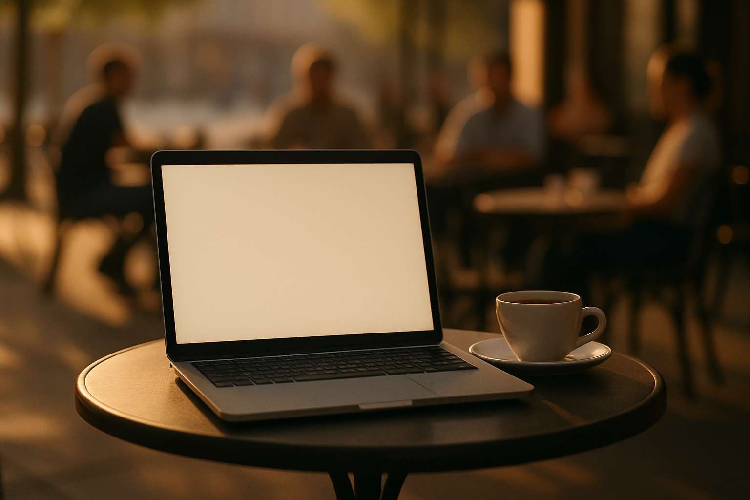 A small round table at an open-air café in the early morning. A laptop is placed on the table, facing slightly to the left but mostly toward the camera. The screen is turned on but blank, taking up most of the frame. A cup of coffee sits beside the laptop. In the background, several people are sitting casually at different tables, softly out of focus. None of them are close to the camera. The camera is fixed and slightly zoomed in to emphasize the laptop screen. The scene is softly lit in warm morning light, shot in cinematic style with shallow depth of field.