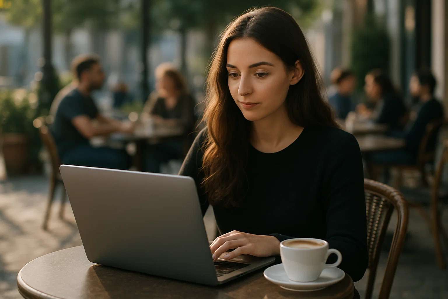 At an open-air café in the early morning, a laptop sits on a small round table, angled slightly to the left but mostly facing the camera. A cup of coffee is next to it. A long-haired woman is already seated in front of the laptop, calmly looking at the screen. Several people are sitting casually at other tables in the background, softly out of focus. After a few seconds, the woman closes the laptop, picks it up, and walks away. The camera remains fixed throughout. The scene is softly lit in warm morning light, shot in cinematic style with shallow depth of field.