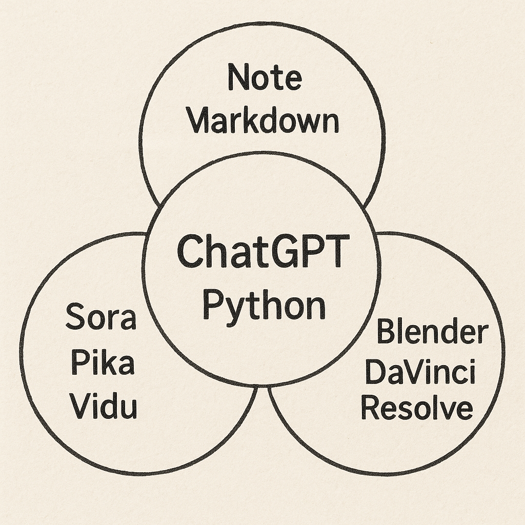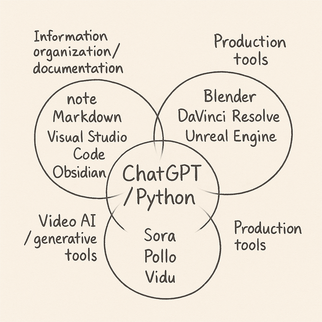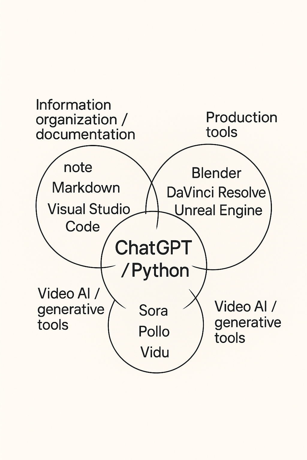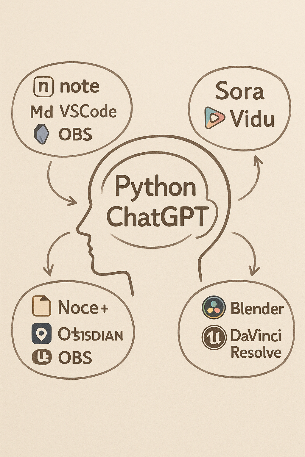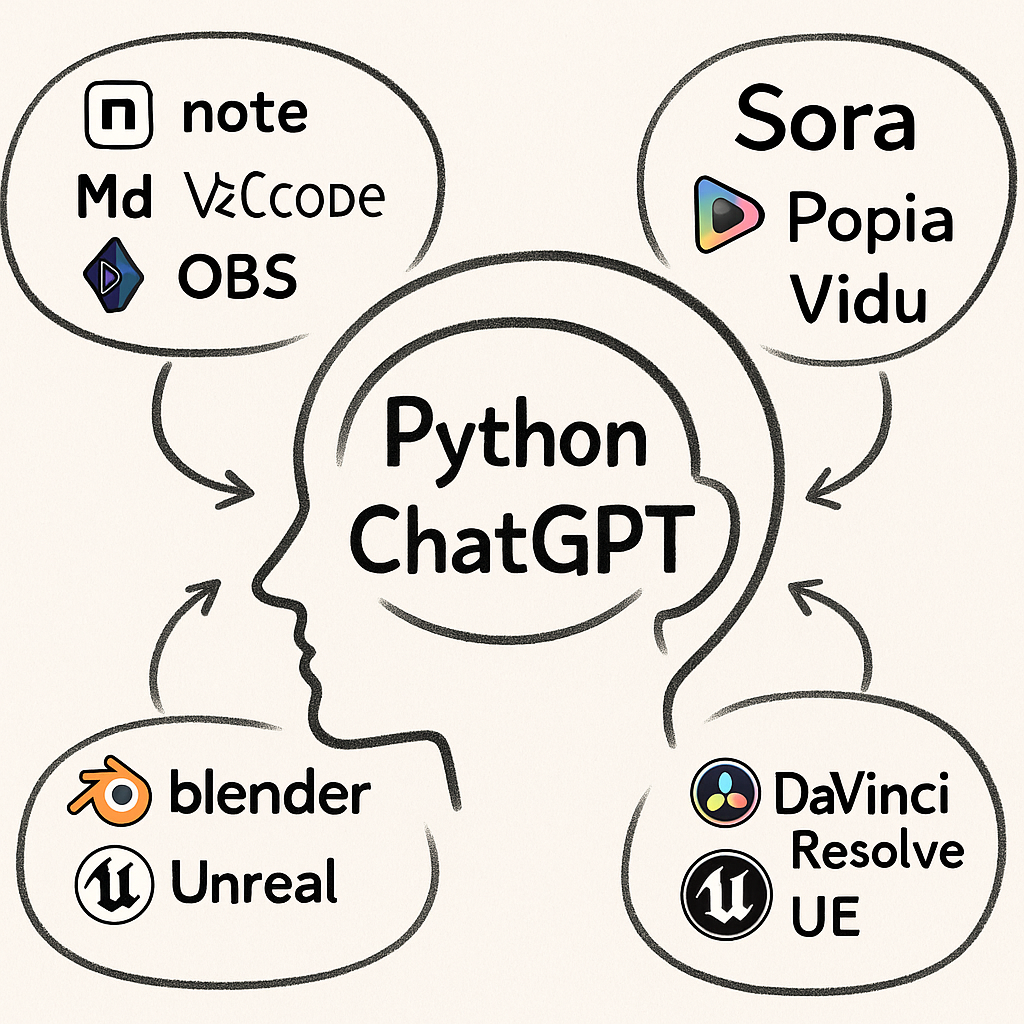 構成自体は「君(ChatGPT)を軸に、Blender、DaVinci、Unreal、音楽生成、動画AIなど複数ツールを横断しながら、創作や試行を行っている姿」が伝わるもので、非常に的確です。