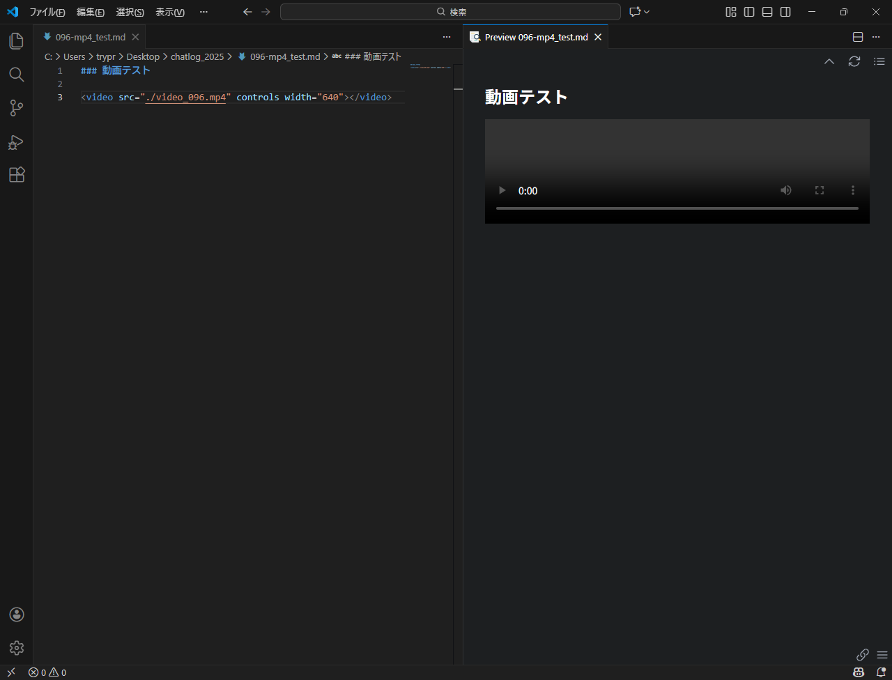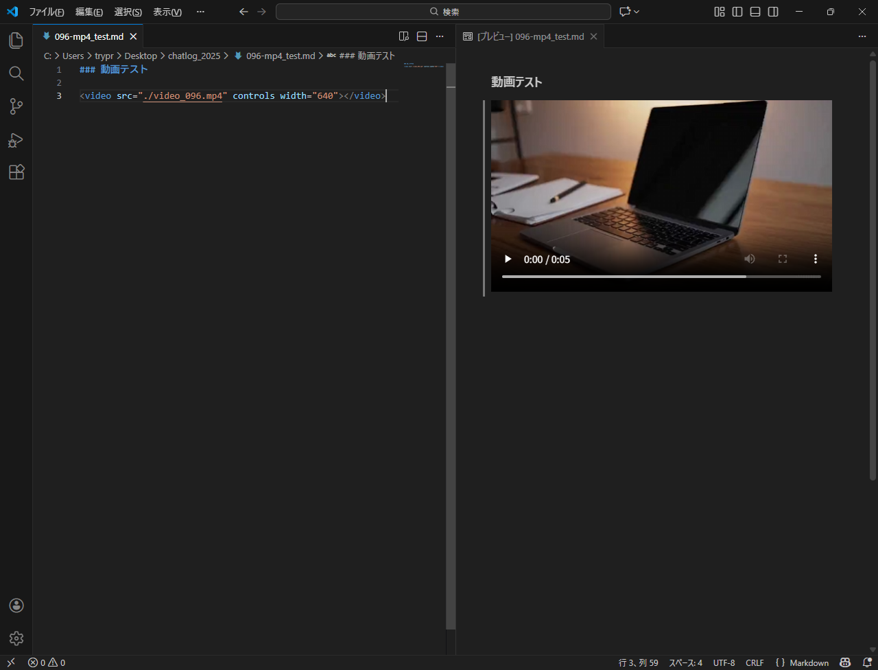 ファイルパスも Markdown ファイルと .mp4 が同じフォルダにあるので問題なさそう