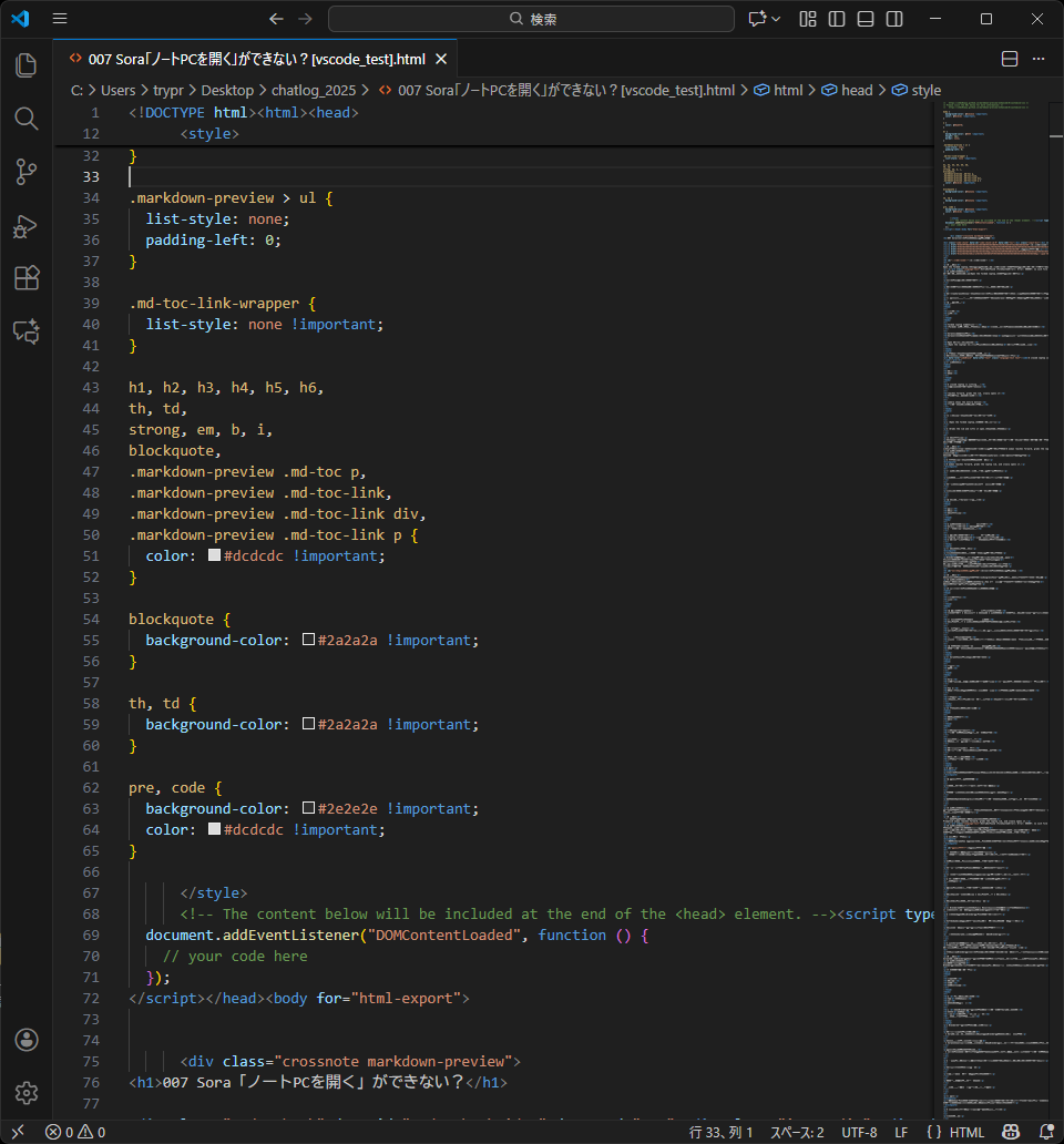 VS CodeのエクスポートCSSは body hr や .markdown-preview code など詳細度が高いセレクタを使っていて、通常の上書きが効きにくい