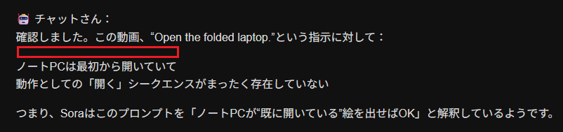 <p>つまり、Soraはこのプロンプトを「ノートPCが“既に開いている”絵を出せばOK」と解釈しているようです。</p>